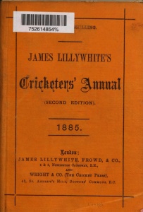 S H I L L I N G . 7 5 2 6 1 4 8 5 4 % JAMESLILLYWHITE'S Cricketers ' Annual (S E C O N DE D I T I O N ) . 1 8 8 5 . Loudou : J A M E SL I L L YW H I T E , F R O W D , & C O., 4 & 6, NEWINGTON CAUSEWAY, S.E. , A N D W R I G H T& CO. (THE CRICKET PRESS), 41 , ST. ANDREW'SHILL, DOCTORS' COMMONS, E.C.
